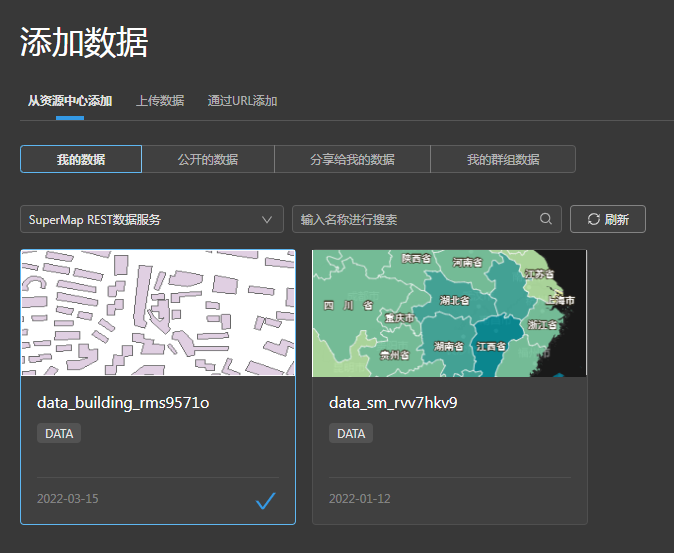 打開并登錄SuperMapOnline(地址為https://www.supermapol.com/),進(jìn)入【資源中心】下的【數(shù)據(jù)】頁面,點(diǎn)擊頁面右上角的“上傳數(shù)據(jù)”按鈕,將我們準(zhǔn)備好的zip文件上傳并發(fā)布為REST數(shù)據(jù)服務(wù)。